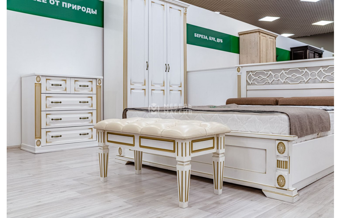 Кровать Пальмира (белая эмаль с золотой патиной) отличается высоким изголовьем, украшенным резьбой, и низким сплошным изножьем. Обе спинки модели плавно переходят в устойчивые ножки, защищающие напольное покрытие. Изделие, которое можно купить по доступной цене в нашем интернет-магазине, сделано из натурального древесного массива.| Размер | Цена | |