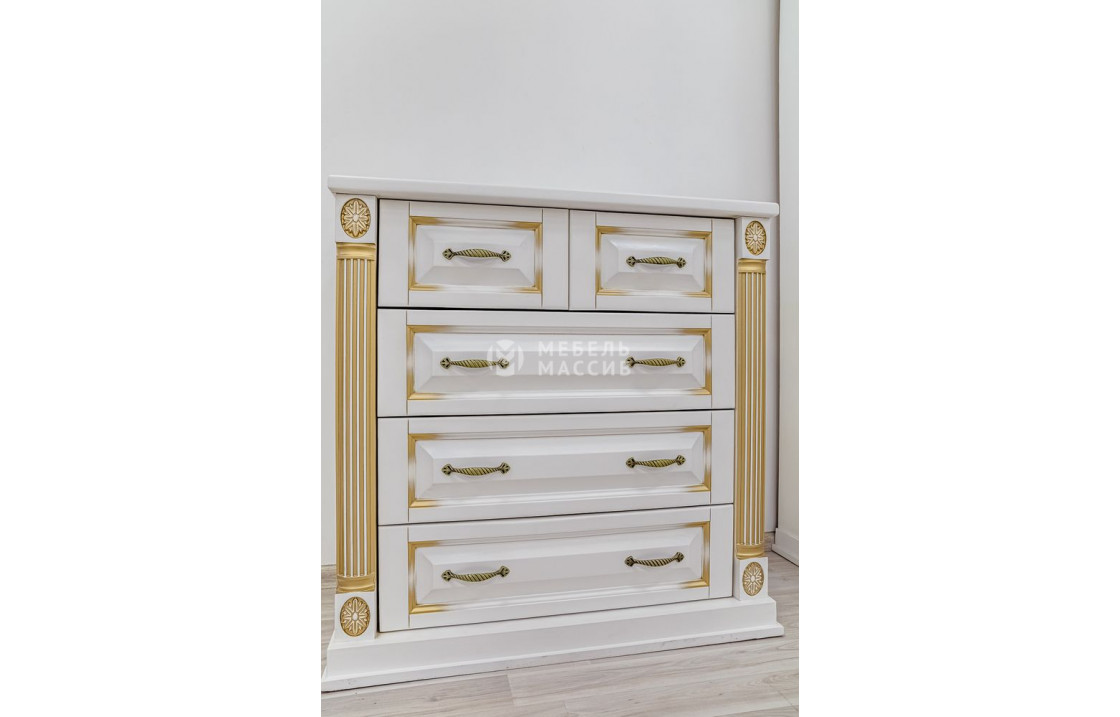 Комод Пальма (белая эмаль с золотой патиной) вдохновлён архитектурой эпохи классицизма, на что указывает стилизованная под античные колонны резьба. изделие имеет устойчивое основание и 5 выдвижных ящиков (3 больших и 2 средних). купив его в интернет-магазине по выгодной цене, вы сможете облагородить интерьер любого помещения.| Размер | Цена | |