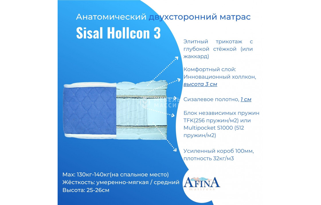 двусторонний Coir Hollcon 3 / Sisal Hollcon 3 от фабрики афина с пружинным блоком tfk-256 (256 пружин на кв. метр) или multi-512 (512 пружин на кв. метр) на выбор. чехол жаккард стёганный 180-220 гр/м2 или элитный трикотаж с объёмной стёжкой 300гр/м2 на выбор. купите по цене производителя в интернет-магазине мебель массив.| Размер | Цена | |